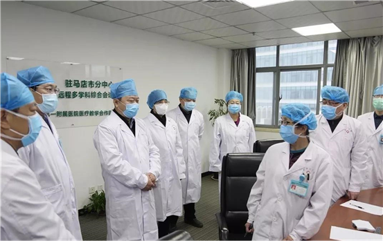 在市中心医院远程会诊中心,医院新冠肺炎专家组正在向平舆县人民医院提供会诊指导,市委书记陈星看望了正在进行视频连线会诊新冠肺炎的医务人员。并向坚守在一线的医务人员表示慰问和感谢。他叮嘱大家,要切实加强自身防护,忠实履行好人民健康卫士的神圣职责,坚决完成好党和人民赋予的使命任务。