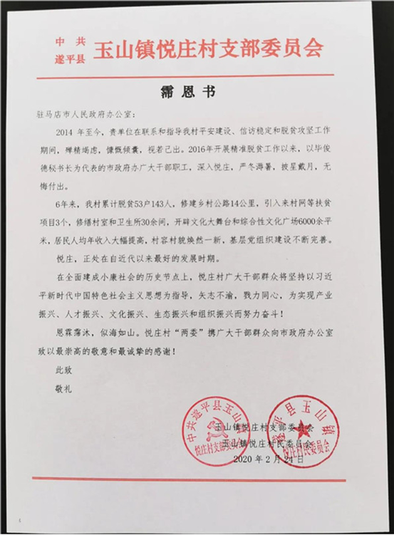 脱贫奔小康 恩情永不忘 ——悦庄村干部群众致市政府办公室的一封信