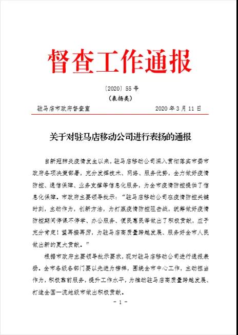 驻马店市政府主要领导高度赞扬驻马店移动公司疫情防控责任担当