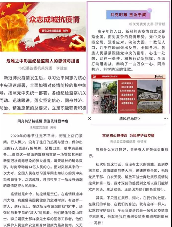 机关各支部积极行动,360余名党员利用2月份主题党日在支部开展抗疫专题“微党课”人人讲活动,各支部向机关党委推荐了优秀讲稿63篇。机关党委筛选出主题鲜明、内容深刻、图文并茂的讲稿30篇,在“清风驻马店”微信公众平台开辟专栏进行展播。选登出来的优秀讲稿被机关党员干部积极转发,进一步强化了党课的教育效果。
