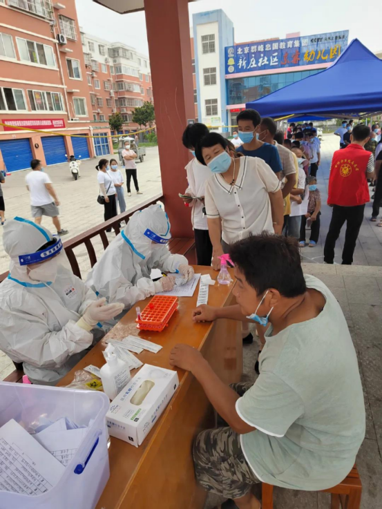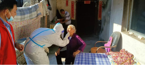 “来,小朋友嘴巴张开,说“啊”~,好,小朋友真棒!”身着厚厚防护服的任青,温柔的对前来采集核酸的小朋友说。虽然小区内搭建着遮阳棚,但依然抵挡不住炎炎烈日。此时任青的防护服内早已是汗如雨下。但是她没有丝毫的退缩,依然坚持在核酸采集第一线。八百,九百,一千……仅仅用了半天时间,任青一组就已经采集了一千份核酸样本。 就在核酸采集接近尾声时,社区的工作人员过来说,还有十几户行动不便的老人和精神异常的被采集人员,只能入户采集。任青一听主动说:“我去”。由于农村的路况不好,任青不顾自己身心疲惫,穿着厚厚的防护服,又跟随社区人员深一脚浅一脚的向住户家中走去……