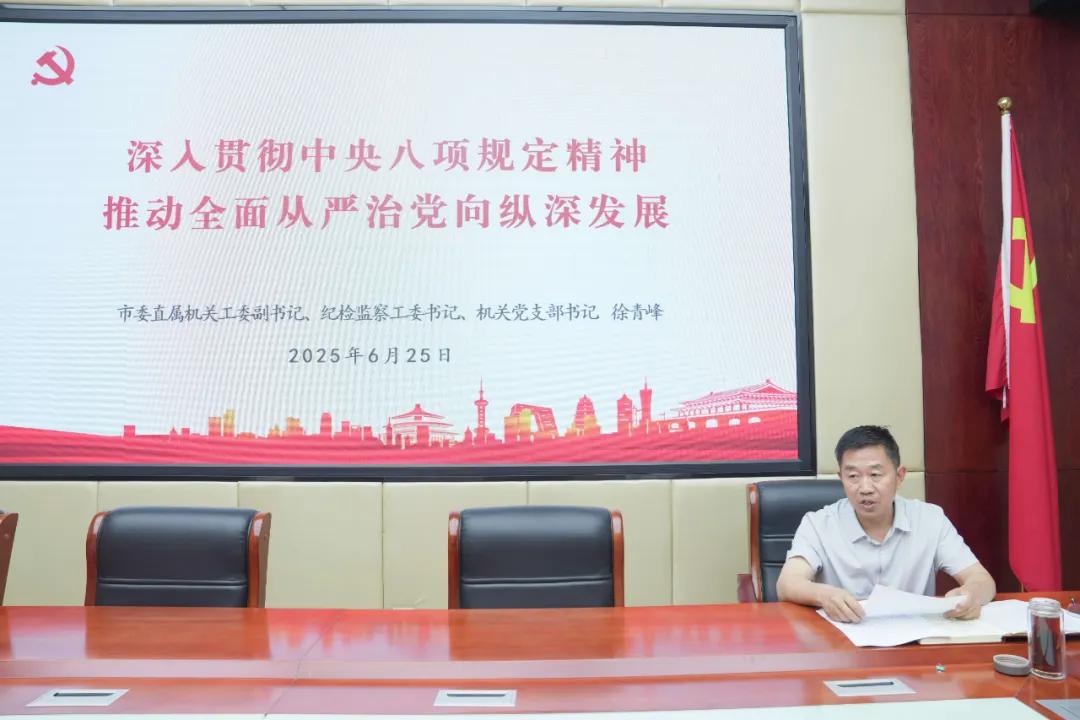6月25日,市直工委机关党支部开展“落实中央八项规定精神 坚守廉洁底线”主题党日活动。市直工委书记王红卫出席并讲话,副书记、纪检监察工委书记、机关党支部书记徐青峰主持,机关党支部全体党员参加。