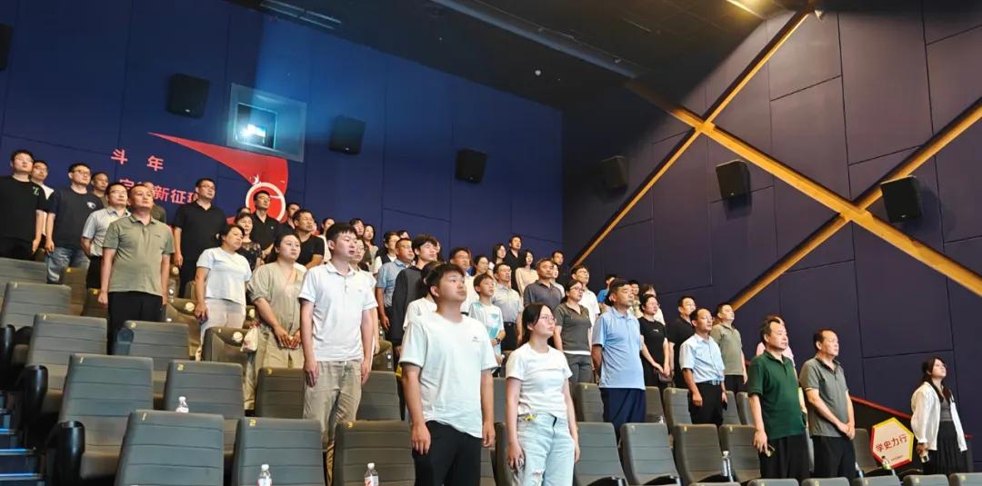 观影结束,大家心潮澎湃,起立共唱国歌。嘹亮的国歌声中,鲜红的党旗在银幕前高高飘扬,震撼与热泪交织成一堂最生动的党课。