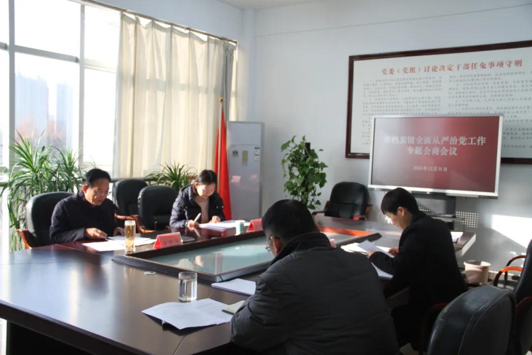12月31日,市档案馆召开全面从严治党工作会议。市档案馆馆长王建华主持会议并讲话。会议集中学习了12月9日中共中央政治局会议精神,班子成员结合分管工作对2024年度落实全面从严治党主体责任履职情况逐一作了汇报。市纪委监委派驻第一纪检监察组副组长赵淑婧通报了履行全面从严治党主体责任监督调研反馈意见,并就进一步落实全面从严治党主体责任提出意见建议。会议要求,要加强政治建设,始终坚持“档案工作姓党”;要履行好主体责任,严格落实“一岗双责”;要加强党风廉政建设,巩固深化党纪学习教育成果,以严明纪律规矩护航档案事业高质量发展。